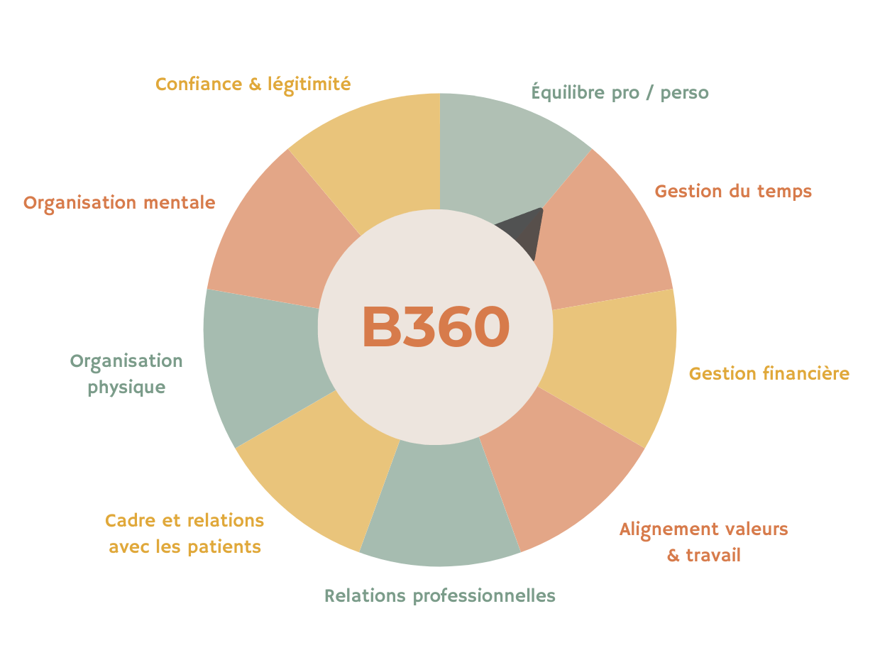 Oui : parfois le sujet n’est pas l’organisation, mais le manque de recul, de priorisation, ou un cadre qui s’est “étiré” avec le temps. B360 sert justement à objectiver ce qui mérite d’être ajusté. Un état des lieux est réalisé sur 9 domaines, de quoi explorer l'ensemble des pans de ton exercice professionnel.