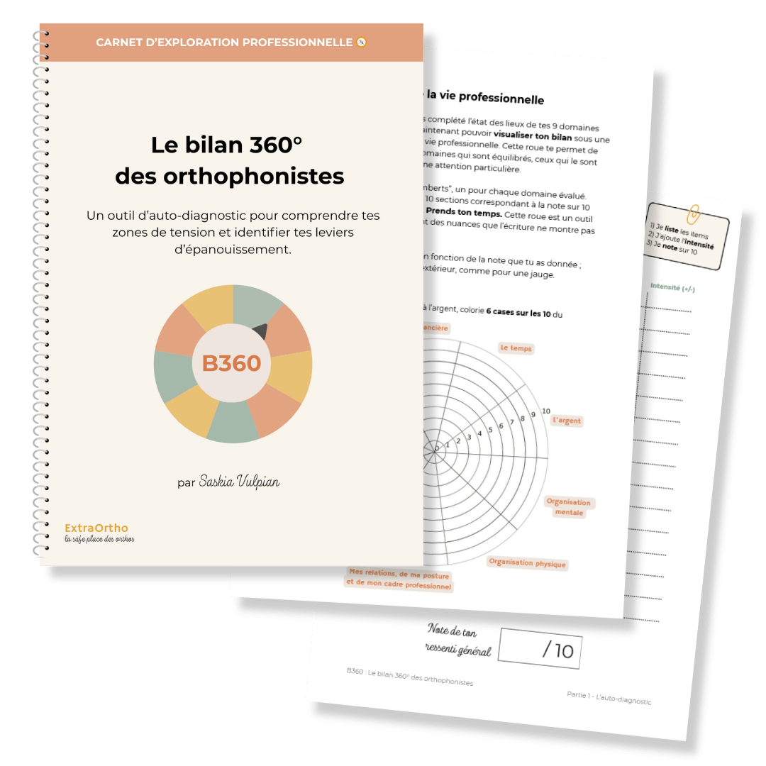 B360 est un outil d’auto-diagnostic guidé (ebook à imprimer) qui t’aide à prendre du recul sur ton quotidien d’orthophoniste, repérer tes zones de tension et construire un plan d’action concret et réaliste pour améliorer ton quotidien professionnel.